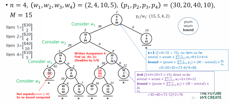 → 아이템을 최대한 넣되, k번째에서 초과 발생 - bound = psum + ∑(i+1 to k-1) pi + (M - wtotal) * pk / wk