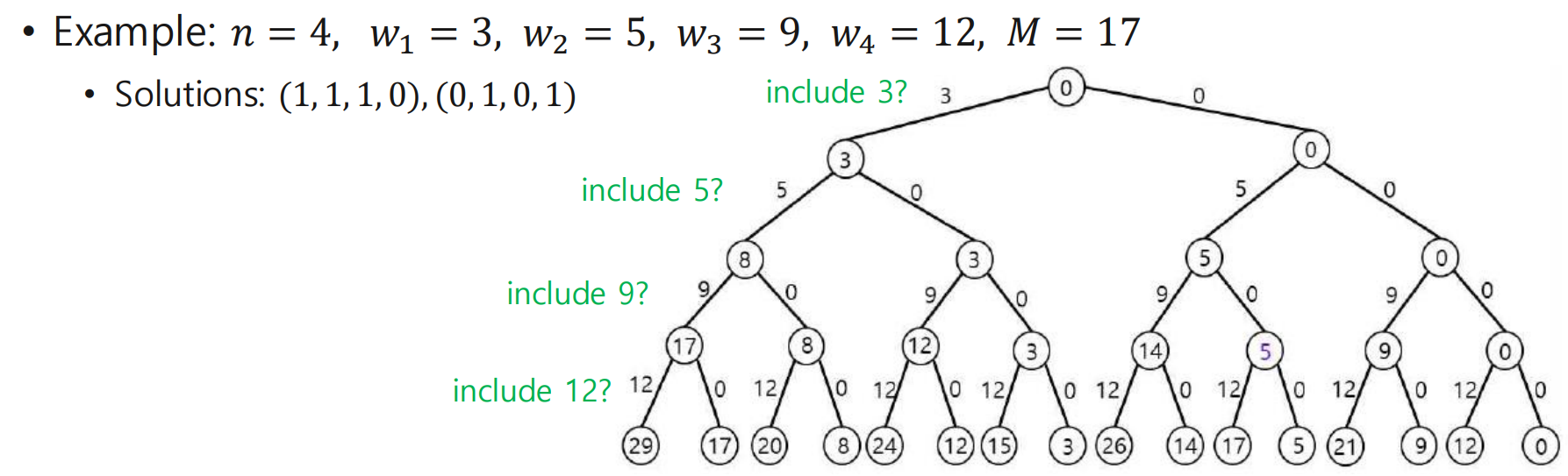 sum_of_subsets(i+1, wsum, rsum - w[i+1]) # exclude