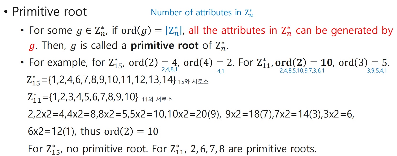 정의: 어떤 g∈Zn∗에 대해 ord(g)= |Zn∗|=ϕ(n)이면, g의 거듭제곱으로 군의 모든 원소를 생성할 수 있으므로,