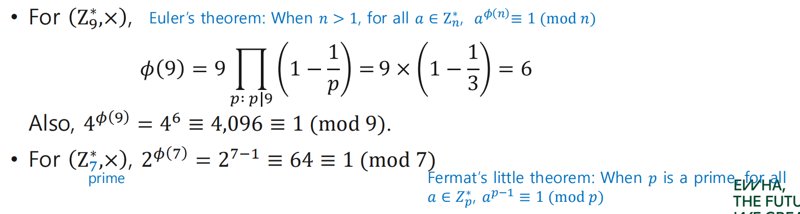 - When n>1, for all a∈Z_n*, a^𝜙(𝑛) ≡ 1 (mod n)