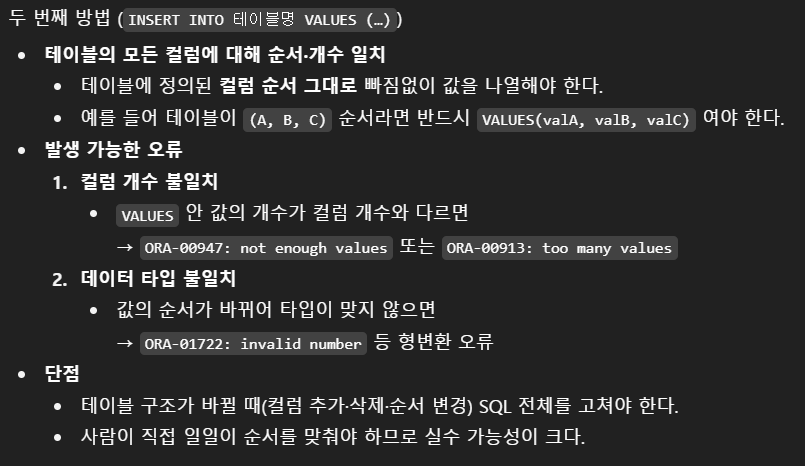 - 두 번째 SQL의 경우 전체 컬럼에 대한 데이터가 테이블의 컬럼 순서대로 빠짐없이 나열되어야 하는데 순서가 뒤바뀌어 데이터 유형이 맞지 않거나 누락된 데이터가 있어 전체 컬럼 개수와 맞지 않았을 경우 데이터베이스는 에러를 발생시킴.