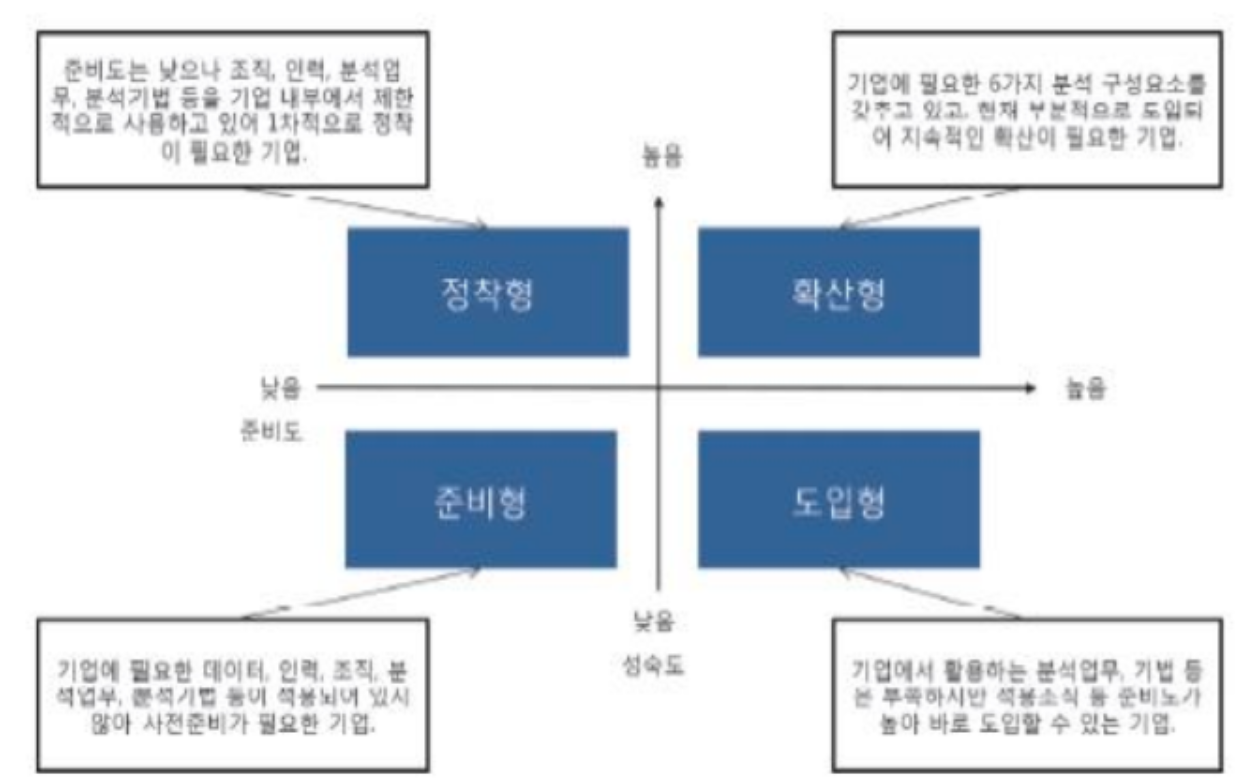 - 준비형: 기업에 필요한 데이터, 인력, 조직, 분석업무, 분석기법 등이 적용되어 있지않아 사전준비가 필요한 기업