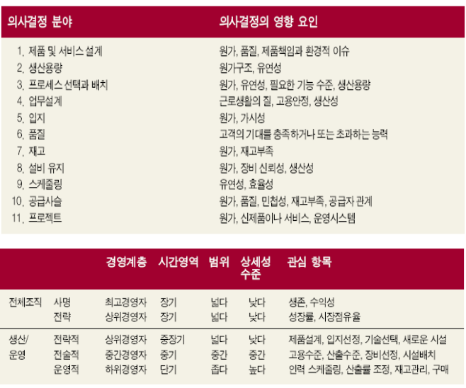 - 제품, 프로세스, 생산방법, 운영자원, 품질, 원가, 리드타임 및 일정계획 등과 관련